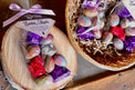 Easter treat bags with 3 sea salt caramel in milk chocolate wrapped in colour foil and 6 solid milk chocolate eggs decorated with coloured cocoa butter.